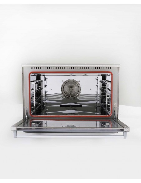 Équipement : thermostat 0-300°C, minuterie sonore 120’ avec position pour utilisation en continu, 2 lampes intérieures. Bouton poussoir pour l’injection de vapeur, turbine Ø 210, moteur 2 vitesses à rotation alternée toutes les 2 minutes, en demie puissance (pour les soufflés, meringues, muffins…) ou pleine puissance pour diffuser la chaleur dans toute l’enceinte du four, système de refroidissement du moteur. Modèle équipé d’une salamandre quartz ventilée