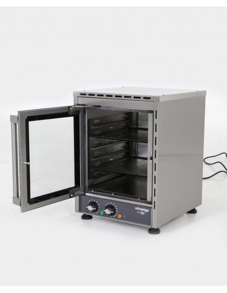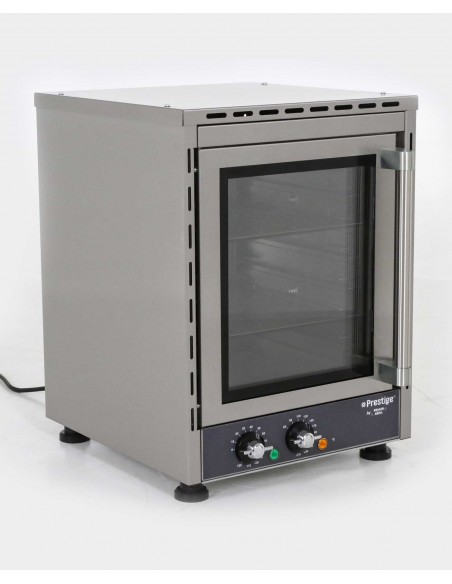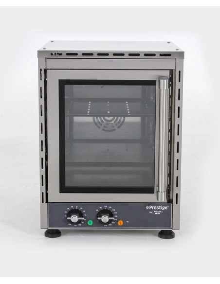 Équipement : thermostat de régulation 0-250°C, thermo-ventilateur, minuterie 120’, voyants de contrôle. Livré avec 2 grilles de cuisson et 1 plat à pâtisserie.
