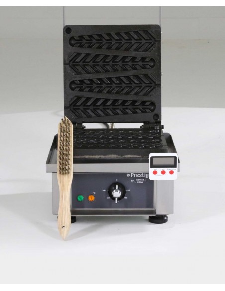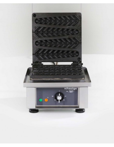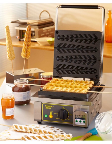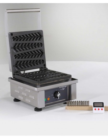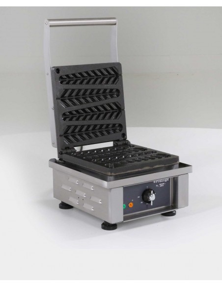 Ce gaufrier électrique professionnel comporte des plaques en fonte brute. Ces plaques en forment d’épi permettent la réalisation de gaufres en bâtonnet en forme d’épi de blé.