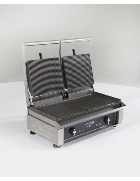 Équipement : thermostat de régulation 0-300°C, tiroir ramasse-jus, poignées thermorésistantes, interrupteur marche/arrêt, voyants de contrôle. Livré avec un grattoir facilitant l’entretien.