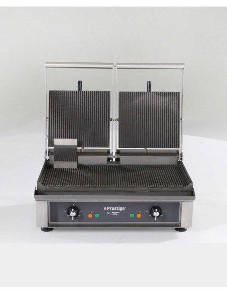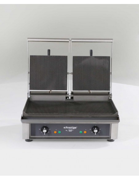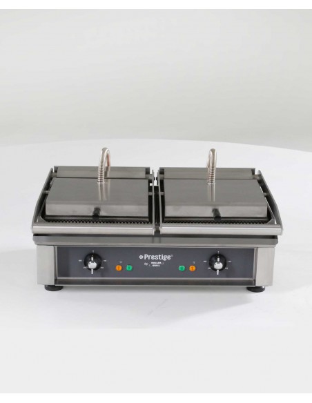 Pour saisir vos steaks, sandwiches, hamburgers à cœur, sans réduction et en conservant les jus et vitamines, rien ne vaut le contact-grill Roller Grill. Les plaques en fonte à forte valeur de conduction permettent une cuisson parfaitement homogène. La plaque supérieure est auto-balancée et le ressort de pression réglable pour adapter la cuisson aux aliments.